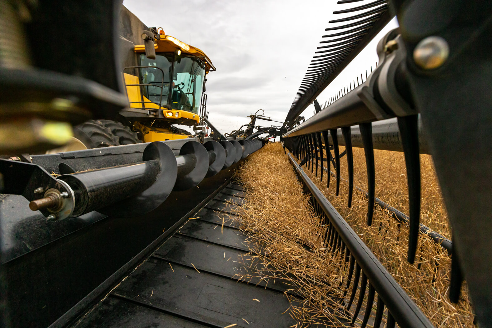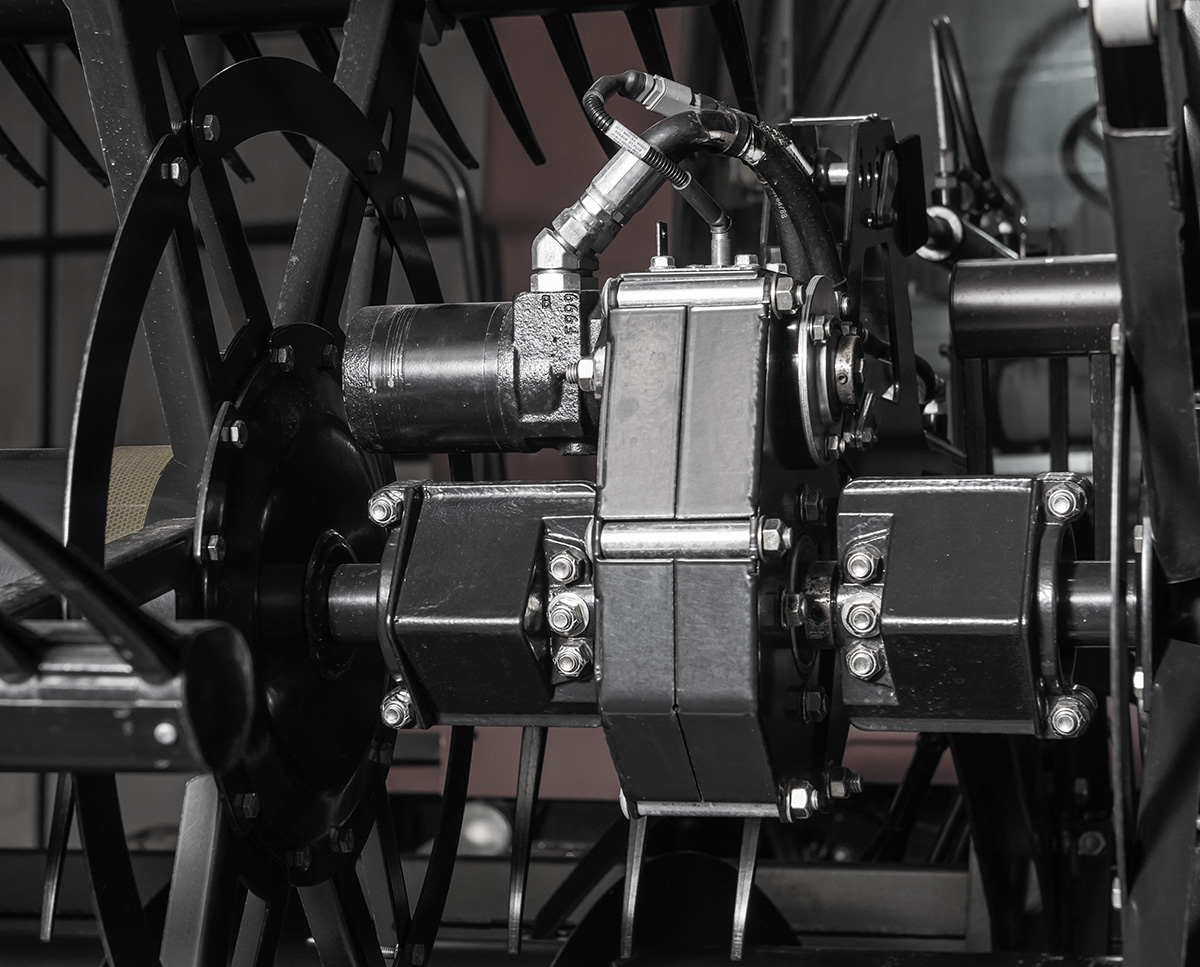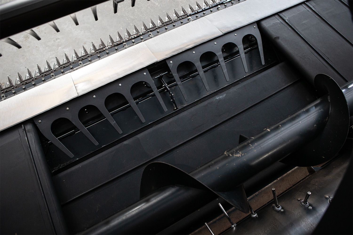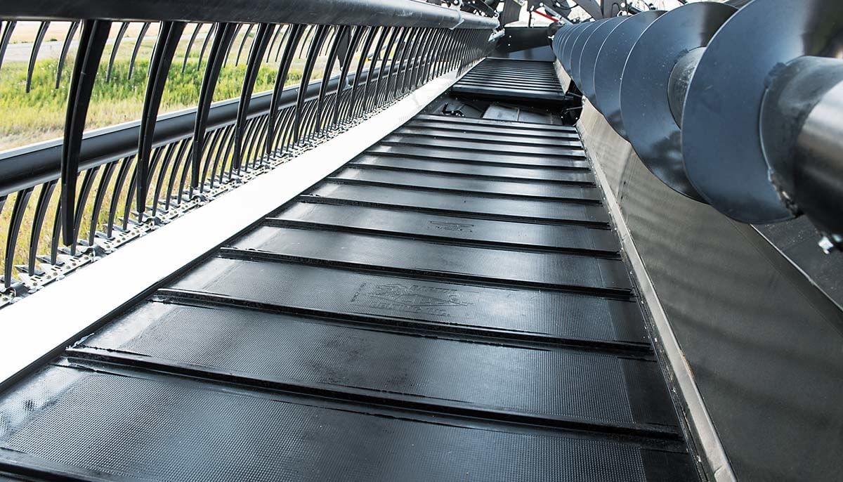 A larger 12” diameter hydraulic cross auger improves material flow from the drapers to the feed auger, adjusting for bulky and tangled crops like peas and mustard.